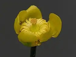 Nuphar × spenneriana is a perennial, rhizomatous, aquatic plant.[2] The leaf blade is 7–18 cm long, and 5–14 cm wide.[3] The abaxial leaf surface has trichomes towards the leaf margin[4][3] but trichomes are absent towards the centre. Trichomes also may be absent entirely.[3] The leaf has 15-22 primary nerves.[5] The petiole is 3–7 mm wide.[3]