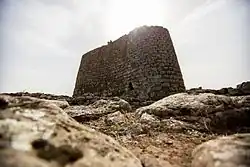 The nuraghe Losa (in Sardinia, close to the village of Abbasanta) is a complex prehistoric building in the shape of a tholos tomb.[1] Its central structure has a triangular shape.[2] On the west side, a turreted wall is linked to it. The whole built complex is surrounded by a wider wall, which encloses the settlement of the original village of huts and other additional buildings constructed in the late Punic, imperial Roman, late Roman and high Middle Ages periods. The central tower was built in the 14th century BC, while the surrounding walls and towers were built in the 13th century BC.