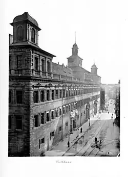 In the northeast corner of the large courtyard of the town hall and on the south side of Theresienstrasse, new buildings in the neo-Gothic style were constructed in 1885–1889 according to plans by August Essenwein. Hans Pylipp built, at about the same time, a new office building in place of the old Fünferhaus on Fünferplatz. Heinrich Wallraff based his 1907–1910 new buildings north of Theresienstrasse on the Nuremberg Renaissance of the 16th century. Among other things, parts of the buildings of the former Dominikanerkloster were demolished for this purpose.