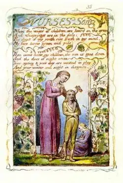 The poem in Songs of Innocence tells the tale of a nurse who, we are to assume, is looking over some children playing in a field. When she tries to call them in, they protest, claiming that it is still light and therefore there is still time to play. The poem fits in with the theme of innocence, as it makes no mention of the negative aspects of playing outside; the children are oblivious of the dangers of playing outside late at night that would be considered in a modern society. The language uses various images associated with children's playing and imagination. The nurse is of a jovial and warm-hearted nature, as she allows the children to continue with their games, with no thought for the wider consequences. In his commentary, Sir Geoffrey Keynes wrote that one critic said that "few besides Blake could have written such a successful poem on the delight of being allowed to play a little longer until dusk".[1]