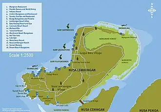 It is connected to Nusa Ceningan Island through a narrow suspension bridge who collapsed in 2016 and rebuilt.[16][17]