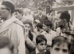 In his youth, Nusrat joined his father's qawwali party as a tabla player whilst continuing to learn the intricacies of singing.[21] In 1964, after the death of his father Fateh Ali Khan, Nusrat became the lead singer of the qawwali party alongside his uncle Mubarak Ali Khan.[22] The party also included Mujahid Mubarak Ali Khan, the son of Mubarak and the cousin of Nusrat Fateh Ali Khan.[22] After the death of Mubarak Ali Khan in 1971, the party became known as Nusrat Fateh Ali Khan, Mujahid Mubarak Ali Khan & Party.[23] As Nusrat's prominence grew, the party eventually became recognised as Nusrat Fateh Ali Khan & Party.[23] One of Khan's earliest public performances as leader of the family qawwali group was in March 1965, at a studio recording broadcast as part of an annual music festival organised by Radio Pakistan, known as Jashn-e-Baharan.[21][24][25] The performance drew praise from legends such as Bade Ghulam Ali Khan, Umid Ali Khan, Roshan Ara Begum, and Amanat Ali Khan.[21] Khan sang mainly in Urdu and Punjabi and occasionally in Persian, Braj Bhasha, and Hindi. Among Khan's first major hits in Pakistan was the punjabi qawwali Ni Main Jana Jogi De Naal which he composed and first performed live in 1971, with a studio version subsequently recorded in 1973.[26] The lyrics to Ni Main Jana Jogi De Naal were written by Bulleh Shah, a 17th century Sufi poet.[27] Another of Khan's early hits in Pakistan was the qawaali 'Haq Ali Ali which featured restrained use of his sargam improvisations.[28][29]
