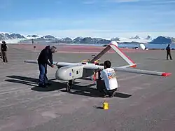 The flying boats did not require any specific infrastructure, although they had to be brought by ship to Ny-Ålesund, where they were assembled. They took off from a manually groomed air strip on snow.[7] For the airship expeditions, a hangar and a mast were needed. Twenty-two carpenters arrived in October 1925 along with supplies on SS Alekto. Materials were transported to the site by railway after a track had been laid to the site from the port. The 35-meter (115 ft) tall steel mast was completed in December. The wooden hangar was 110 by 34 meters (361 by 112 ft) with a height of 30 meters (98 ft). It was covered in 10,000 square meters (110,000 sq ft) of tarp. The hangar was completed on 15 February 1926.[4]