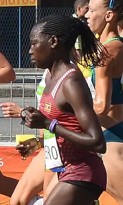 Nyakisi Adero (born 2 July 1986) is a Ugandan long-distance runner. Adero stopped competing in 2011–12 after giving birth and returned to track in May 2012. She ran her first official marathon in October 2015, at the Amsterdam Marathon. She set a new Ugandan record at 2:34:54 and qualified for the 2016 Olympics.[2] She placed 68th at the Rio Olympics.[3]