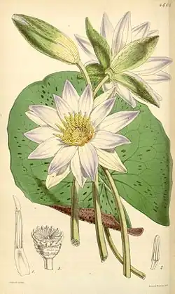 - ^ a b c d Caspary, J. X. R. (1866). Nymphaeaceae. Annales Musei Botanici Lugduno-Batavi, 241–256. http://www.biodiversitylibrary.org/openurl?ctx_ver=Z39.88-2004&rft.date=1866&rft.spage=243&rft.volume=2&rft_id=http://www.biodiversitylibrary.org/bibliography/113&rft_val_fmt=info:ofi/fmt:kev:mtx:book&url_ver=z39.88-2004