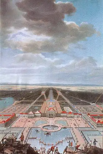 The palace was commissioned by the electoral couple Ferdinand Maria and Henriette Adelaide of Savoy to the designs of the Italian architect Agostino Barelli in 1664 after the birth of their son Maximilian II Emanuel. During its construction Barelli was again replaced (1674) by Enrico Zuccalli.[1] The concept for the mythological decorative programme was supplied by the scholar Emanuele Tesauro of Turin; the ceiling paintings were by Antonio Triva and Antonio Zanchi.[1] The central pavilion was completed in 1675. As a building material, it utilised limestone from Kelheim. The palace was gradually expanded and transformed over the years.[2] It then quickly replaced the nearby Blutenburg Castle as major hunting lodge of the court and competed to Schleissheim Palace.