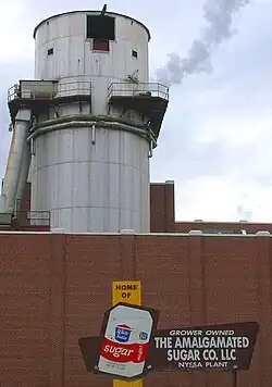 From 1936 until 2005, the Amalgamated Sugar Company (White Satin brand) owned and operated a sugar-processing plant that served as the city's main source of commerce. The closing of the plant resulted in the loss of 600 seasonal jobs.[8][9] The Nyssa plant just a few years previously had produced more sugar than anywhere else for Amalgamated Sugar. To date the plant has been stripped of everything except the brown sugar line. The mechanic shop is still running. Beets are shipped to Nampa, Idaho. Nyssa also had a greenhouse and testing facilities which were later moved to Twin Falls.
