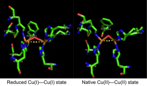 - ^ a b Gerdemann C, Eicken C, Krebs B (March 2002). "The crystal structure of catechol oxidase: new insight into the function of type-3 copper proteins". Accounts of Chemical Research. 35 (3): 183–91. doi:10.1021/ar990019a. PMID 11900522.
