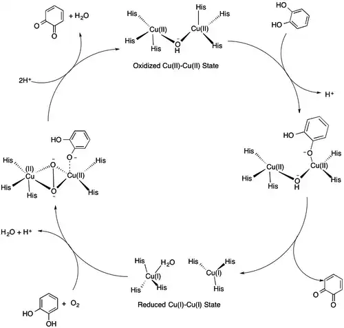 Although a crystal structure of catechol oxidase has been solved, questions concerning the exact mechanism of the reaction remain. One mechanism proposed by Eicken et al. is based on the crystal structure of catechol oxidase purified from Ipomoea batatas.[11] The catalytic cycle begins with the catechol oxidase in its native oxidized Cu(II)-Cu(II) state with a coordinated hydroxide ion bridging the two copper centers. As catechol enters the active site, a proton is abstracted from one of the alcohols. The catechol coordinates with a Cu(II) center in a monodentate fashion, displacing one of the coordinating histidine residues. The coordinated hydroxide ion abstracts another proton from catechol to form water, and the catechol is oxidized to o-quinone. The two resulting electrons reduce both copper centers to their Cu(I)-Cu(I) state. Dioxygen then binds one copper center, displacing the coordinated water molecule, and another molecule of catechol binds to the other copper center, displacing another histidine residue. This forms a complex in which one copper center has a tetragonal planar coordination with His240, His244 and the dioxygen molecule. The other copper center retains its initial tetragonal pyramidal geometry with dioxygen, His88 and His118 in the equatorial positions, and His109 in an axial position.[3] In this state, the enzyme active site is in a ternary catechol oxidase–O22−–catechol complex. Two electrons are transferred from the substrate to the dioxygen, followed by cleavage of the O–O bond. Water is released, and the second o-quinone product is formed together with the restoration of the initial Cu(II)-Cu(II) state to complete the catalytic cycle.[15]