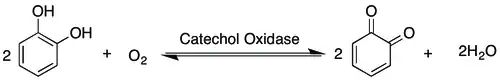 Catechol oxidase is a copper oxidase that contains a type 3 di-copper cofactor and catalyzes the oxidation of ortho-diphenols into ortho-quinones coupled with the reduction of molecular oxygen to water. It is present in a variety of species of plants and fungi including Ipomoea batatas (sweet potato)[1] and Camellia sinensis (Indian tea leaf).[2] Metalloenzymes with type 3 copper centers are characterized by their ability to reversibly bind dioxygen at ambient conditions.[3] In plants, catechol oxidase plays a key role in enzymatic browning by catalyzing the oxidation of catechol to o-quinone in the presence of oxygen, which can rapidly polymerize to form the melanin that grants damaged fruits their dark brown coloration.