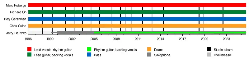 O.A.R. (short for Of A Revolution) is an American rock band, founded in 1996 in Rockville, Maryland.[1] The band consists of lead vocalist/guitarist Marc Roberge, drummer Chris Culos, guitarist Richard On, bassist Benj Gershman, and saxophonist/guitarist Jerry DePizzo. Touring members include trumpet player Jon Lampley and keyboardist Mikel Paris. Known for their live shows and extensive summer touring, the band has released ten studio albums and six live records—most recently Live From Boston in December 2024. Four of its members grew up in Rockville and attended Thomas S. Wootton High School. After graduating, they studied at Ohio State University, where they met DePizzo from Youngstown, Ohio.