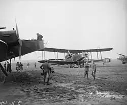 On 6 August the aircraft was used to bomb warehouses and ships in the harbour of Pandera on the south shore of the Marmara, and was then used on anti-submarine patrols until 2 September, when it was sent to bomb Adrianopolis. En route the crew dropped two bombs on a submarine as it dived, before dropping two more on Kuleli Burgas and then the rest on the Adrianopolis railway station buildings. On 30 September, (flown by John Alcock), it raided railway stations near Constantinople and Haidar Pasha but was forced to ditch in the Gulf of Xeros, after an engine failed. The crew floated with the aircraft for two hours and fired Very lights but were not seen by British destroyers. They then swam for an hour to reach the Gallipoli peninsula, where they were captured.[23] Another Handley Page was flown from England to reinforce the Palestine Brigade and served with 1 Squadron, Australian Flying Corps. In September 1918, the bomber was used to supply Colonel T. E. Lawrence and the Arabs.[24]