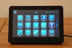 The interface consists of a home button, the date and time, a Wi-Fi indicator (if connected wirelessly) and app buttons arranged in three rows of five. If more than 15 applications are installed a scroll button is displayed, allowing the user to access the additional buttons. Additional notification icons can be displayed to the right of the home button, such as a musical note indicating that the radio app is playing in the background.