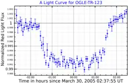 A light curve showing the March 30, 2005 planet transit across OGLE-TR-123. Adapted from Pont et al. (2006)[1]