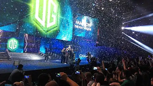 Following that, OG were then placed into group A of The International's group stage, finishing fourth with a record of 9-7, which seeded them into the upper bracket. There, OG won every series to advance to the grand finals.[16][17][18] Facing the lower bracket winner PSG.LGD in it, whom OG had just defeated in the upper bracket finals, OG won the game one, but lost the next two games.[17] Needing another win to avoid losing the series, OG forced a late-game comeback in game four, and subsequently won game five in a similar fashion, making them International champions and winning them over $11 million in prize money.[12][17][18] Their victory was considered a Cinderella and underdog success story, as they had come from the open qualifiers and had beaten some of the more favoured and accomplished teams along the way.[17][18] Their win also broke the historical trend of Chinese teams winning the International in even-numbered years.[13]
