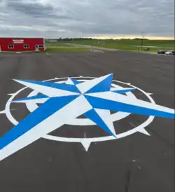 A Compass rose is centered on the main ramp, oriented True north (360T/000T) The airport also features a 1956 North American F-100 Super Sabre, displayed at the entrance to the airport.