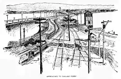 The first use of the site for boats was in 1852, when Gibbons' Wharf was constructed at Gibbons' Point, westward into San Francisco Bay. In 1862, Gibbons' Point was renamed Oakland Point, and the wharf was first used as a ferry landing as part of the San Francisco and Oakland Railroad service. On November 8, 1869, it succeeded Alameda Terminal and became the western terminus of the First transcontinental railroad trains.[1]