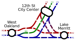 A third track (labeled MX/CX in the above schematic diagram) connecting West Oakland, 12th Street Oakland City Center, 19th Street Oakland, and MacArthur stations was completed in 1986.[10][7] Originally the MX/CX was used for peak hour service (westbound towards San Francisco in the morning, and eastbound in the evening).[11] Since 1992, it has been used almost entirely for eastbound Yellow Line trains, allowing for cross-platform transfers with Orange Line trains.[12]