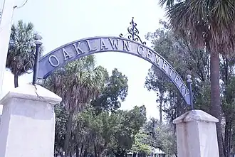 Oaklawn Cemetery includes a section for Catholic burials called St. Louis Catholic Cemetery. The two graveyards were added as a Historic District to the U.S. National Register of Historic Places on September 19, 2017.[1] The Sexton House was used for equipment storage and maintenance activities. The cemetery was of the "Rural Cemetery" style.[2] The First Mayor of the City of Tampa, Judge Joseph B. Lancaster, is buried at Oaklawn, as is the 6th mayor, James McKay Sr. Others include pirates, slaves, yellow fever epidemic victims and confederate soldiers. Notable areas and gravesites in the cemetery include the gravesites of Henry Laurens Mitchell, John T. Lesley Family, Samuel Friebele, Charlie Wall, the Hooker Family, James McKay Jr., James C. Field, Joseph B. Lancaster, the Krause Family, the Wall Family, mass graves, gravesite of James T. Magbee, the gravesites of William and Nancy Ashley,[3] gravesites of John P. Wall, James Gettis,[4] grave art, and the "Cradle Graves."[5]