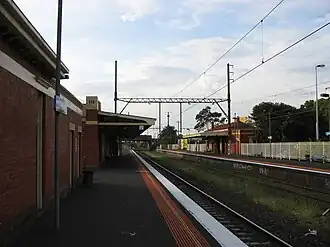 In c. 1910, the station featured two side platforms with an additional centre track. By this time, the station was controlled by two signal boxes; "A" at the city end, controlling the Warrigal Road level crossing and interlocked gates, and "B", between the station and yard, controlling the latter. In 1915, a new station building had been constructed to the same style as Box Hill, Caulfield, Essendon, Heidelberg and Spotswood in the Melbourne area, and Castlemaine and Warragul in the country.[15] A new platform was provided on the south side, plus a fifth track for engines to run around their consists.[16][17]