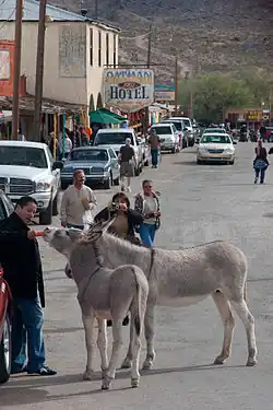The town survives as a nostalgic Route 66 stop with a Wild West feel down to the wooden sidewalks, staged shootouts, and wild burros wandering the streets. The federal government rounds up areawide wild burros using helicopters and said, "Oatman is a very particular case because that town's basically all about burros."[9][10]