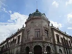 Teatro Macedonio Alcalá is a working theatre and also houses a collection of romantic art.[5] Built between 1903 and 1909, it was originally named the Luis Mier y Terán Theater. The design is typical of the Porfirio Díaz period ending the 19th century and beginning the 20th. It was later renamed the Jesús Carranza Theater. The current name dates back to 1932, honoring the composer of the state anthem "Dios Nunca Muere" (God Never Dies).[21] The theatre has three parts: the vestibule, the main hall and the stage. The main entrance is on the corner. On the Armenta and López Street sides, the lower level is occupied by shops and by the Miguel Cabrera Salon, which hosts art exhibits. The vestibule is Louis XV style with a white marble staircase and the main hall is in "Imperial" style, in which the anthropomorphic columns stand out.[3]