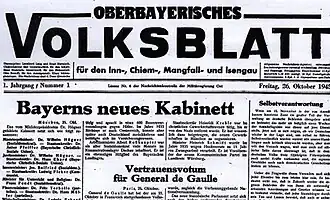 After the Second World War, the United States' occupation force in Bavaria wanted to build up a manageable number of medium-sized regional newspapers with higher circulation instead of the small-scale press landscape prevailing until 1945 with numerous local newspapers. In Upper Bavaria, new newspapers were licensed by the U.S. only in Munich, Ingolstadt, Rosenheim, Garmisch-Partenkirchen and Bad Reichenhall. The license for a new newspaper in Rosenheim was awarded to Leonhard Lang and Ernst Haenisch. On October 8, 1945, the new Rosenheimer daily entitled Oberbayerisches Volksblatt was approved by the U.S. military government in Munich. The license referred to the city of Rosenheim and the former districts Rosenheim, Bad Aibling, Wasserburg and Mühldorf. The Oberbayerische Volksblatt, approved with "License No. 6",[4] was the sixth new newspaper in Bavaria. The first issue appeared on October 26, 1945.