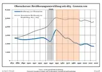 Development of Population since 1875 within the Current Boundaries (Blue Line: Population; Dotted Line: Comparison to Population Development of Brandenburg state; Grey Background: Time of Nazi rule; Red Background: Time of Communist rule)