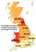 In 2019 Wales had the highest child obesity percentage out of the four constituent countries of the United Kingdom and had a higher obesity rate than England.[67][66][68] One in eight reception age children in 2019 were reported to be obese[69] and 3.3% of children were severely obese.[70]