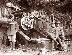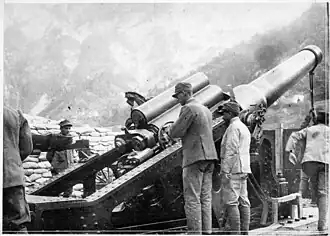 Although the majority of combatants had heavy field artillery prior to the outbreak of the First World War, none had adequate numbers of heavy guns in service, nor had they foreseen the growing importance of heavy artillery once the Italian Front stagnated and trench warfare set in. Fortresses, armories, coastal fortifications, and museums were scoured for heavy artillery and sent to the front. Suitable field and rail carriages were built for these guns in an effort to give their forces the heavy field artillery needed to overcome trenches and hardened concrete fortifications. Indirect fire, interdiction and counter-battery fire emphasized the importance of long-range heavy artillery.[5] In order to address the Italian Army's lack of long-range heavy artillery 254B, 254/40, 305/17, 305/40, and 305/46 Naval Guns were converted to land use.[2]