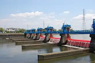 The Kamegawa Dam was built near the Kazusa-Kameyama Station on the JR East Kururi Line on the upper part of the Obitsu River in 1979.[1] The dam forms an artificial lake, Lake Kameyama. The lake is the largest reservoir in Chiba Prefecture with a diameter of 35 kilometers (22 mi).[4]