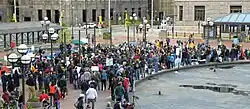 Occupy Minneapolis began as a protest encampment at Hennepin County Government Center plaza on October 7, 2011, renaming the site "The People's Plaza". It was eventually cleared out by law enforcement agencies after members of the Hennepin County Board chose to create new rules restricting the use of the public plaza.[1] As a result, police began to selectively enforce these rules and issue trespass orders against those who were found in violation of them.[2]