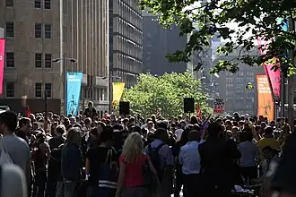 Occupy Sydney was a social movement and protest as part of the global Occupy movements, in Sydney, Australia. The occupation began on 15 October 2011 outside the Reserve Bank of Australia in Martin Place.[1] The Martin Place occupation was first evicted by NSW Police on 23 October 2011.[2] This eviction and later police action was named Operation Goulding. Another eviction attempt occurred on 2 February 2012. The protest site was removed five times in early July 2013, only to re-establish itself each time within hours.