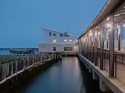 The main terminal building is built over the water, and is a two-story structure, with customs facilities for international passengers on the first floor and a waiting area on the second.[5] The terminal building is connected to the receiving building, located about 300 feet (90 m) away on shore, by a pair of pedestrian ramps.[5] In addition to the receiving building, shore facilities include a 3.5-acre (1.4 ha) parcel of land for parking cars and boarding buses, both local and tour.[5]