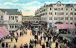 As Ocean Grove drew more and more visitors, the facilities were outgrown, and construction of the present Great Auditorium was completed in 1894. Originally designed to accommodate crowds of as many as 10,000 people, the subsequent installation of theater-style cushioned seating in many sections reduced seating capacity to 6,250.[21] It remains Ocean Grove's most prominent structure and the centerpiece of its summer programs (see more about the Auditorium further down the page). By the early 20th century, said The New York Times in 1986, it was called the "Queen of Religious Resorts ... Visitors would travel miles to bask in the Victorian seaside splendor and to attend engaging, extroverted religious ceremonies. Millions of people, tourists and pilgrims both, made the trip to Ocean Grove every summer."[17] The social disillusionment around 1920 following World War I had a profound effect on Ocean Grove and churchgoing in general. There was a decline in these activities and there was little in the way of new construction in the town after this time. One result was that Ocean Grove became a time capsule of late Victorian and early 20th century architecture.