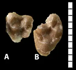 The dental formula of Ocepeia is 3.1.2.33.1.2.3, meaning it has 3 incisors, 1 canine, 2 premolars, and 3 molars on each side of the upper and lower jaw. The ancestral eutherian condition is four premolars, and the evolutionary loss of the 1st and 2nd premolar, along with lack of a gap (diastema) between the canine and premolar, is one of the unique distinguishing traits of Ocepeia similar to those of simian primates.[3][2] The large, stout canine teeth of O. daouiensis are 7.7–8 mm (about .3 in) long and also bear subtle similarities to primate canines.[3][2] The tooth enamel is slightly wrinkled. The third incisor on the upper and lower jaws are small and vestigial.[3]