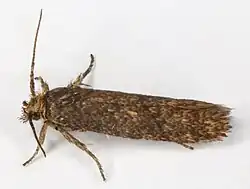 The wingspan is 9–12 mm.[2] Antennae in male hardly, in female rather strongly thickened with rough scales to above middle. Forewings narrower than in Ochsenheimeria taurella, in male rather dark fuscous, in female greyish-ochreous more or less mixed with fuscous. Hindwings are brassy-purplish-fuscous, thinly scaled towards base.[3]