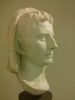 Octavian was raised for at least part of his childhood in his father's hometown of Velletri.[30] Octavian's father, also named Gaius Octavius, came from a moderately wealthy equestrian family of the gens Octavia.[31][25][i] His paternal great-grandfather Octavius was a military tribune in Sicily during the Second Punic War. His grandfather was a banker, while his father became a Roman senator, was distinguished as a praetor by 61 BC,[25][33] and then became a governor of Macedonia.[34][j] His mother, Atia, was the niece of Julius Caesar.[25][31][35]