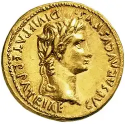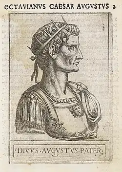- Imperator Caesar ('Commander-in-Chief Caesar'): Octavian's early coins and inscriptions all refer to him simply as Gaius Caesar, but by 38 BC he had replaced Gaius with the victory title imperator 'commander'.[12][13] The use of imperator signified a permanent link to the Roman tradition of victory.[14][d] He transformed Caesar, a cognomen for one branch of the Julian family, into a new family line that began with him.[15] Occasionally the epithet divi filius or divi Iuli(i) filius 'son of the divine Julius' was included, alluding to Julius Caesar's deification in 42 BC.[16][17]