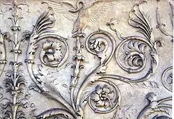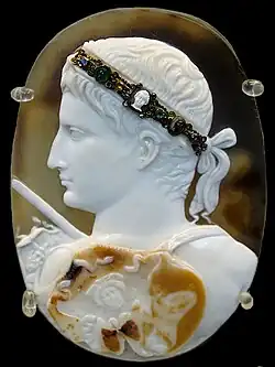 Augustus was granted the right to hang the corona civica (civic crown) above his door and to have laurels drape his doorposts.[175] However, he renounced flaunting insignia of power such as holding a scepter, wearing a diadem, or wearing the golden crown and purple toga of his predecessor Julius Caesar.[194] If he refused to symbolize his power by donning and bearing these items on his person, the Senate nonetheless awarded him with a golden shield displayed in the meeting hall of the Curia, bearing the inscription virtus, pietas, clementia, iustitia – 'valor, piety, clemency, and justice'.[175][195]