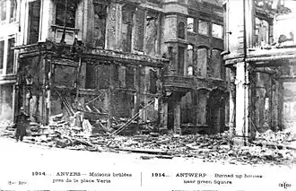 - Siege of Antwerp — Finding no resistance from the defending fortresses around Antwerp, German commanding officer Hans Hartwig von Beseler ceased bombardment and called on Belgian General Victor Deguise to surrender. However, four civilian representatives, including the Mayor of Antwerp Jan De Vos, met with Beseler beforehand to request an end to the bombardment of the city and signed a capitulation. The document forced Deguise to accept the terms a day later and surrender along with 30,000 Allied troops. German troops occupied the city until the end of World War I.[46]