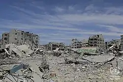 An eyewitness described seeing children transporting other injured children from a scene of "grey dust filling the air" and unidentified bodies, some bleeding and others burned; they also reported seeing mothers screaming, not knowing whether to cry out of being bereaved or to attempt to search for them.[15] Atef Abu Seif, Minister of Culture of the Palestinian Authority of President Mahmoud Abbas and a well-known critic of Hamas, likewise spoke of "apocalyptic" scenes to Der Spiegel, saying more than 50 houses were destroyed, each of which contained "dozens of people" on account of "families and relatives" fleeing previous bombsites.[16] Médecins Sans Frontières reported treating children with burns and deep wounds.[17]