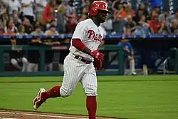 Herrera began the 2018 season with a multi-game on-base streak, the longest to start a season since Matt Holliday reached base in his first 30 games in 2015. On May 7, he recorded his 500th career hit against the Washington Nationals. It was Herrera's 476th major league game, making him the first Phillies player to reach that milestone in fewer than 500 games since Chase Utley in 2007.[36] On May 20, Herrera's on-base streak ended at 45 consecutive games, the fourth-longest in Phillies history. Although he did reach base in the ninth inning, he did so on a dropped third strike, which did not count towards his on-base numbers.[37] Herrera followed his on-base streak with a five-game home run streak in June, tying a Phillies record.[38] Midseason acquisitions like Asdrubal Cabrera and Wilson Ramos pushed Herrera further down the batting order as the season went on, and after he had a 4-for-29 stretch in the middle of August, manager Gabe Kapler considered replacing Herrera in center field with Roman Quinn.[39] Despite setting career highs with 22 home runs and 71 RBIs, Herrera also set career worsts with a .255 batting average, .310 on-base percentage, and .730 on-base plus slugging in 597 plate appearances.[40]
