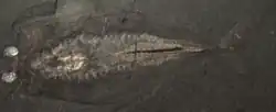Specimens of Odaraia reach up to 15 centimetres (5.9 in) in length.[4] The head has a pair of two large compound eyes on short stalks, with three structures, presumed to be sensory organs, placed on the top of the head between them, which may be present on a distinct round structure, which has been assumed to be the ocular/anterior sclerite. The head either has very reduced or more probably no antennae. The frontmost part of underside of the head had a triangular structure, presumed to be the hypostome. The head has a pair of large mandibles nearly as long as they are wide, the ends of which are covered in pointed "teeth", with setae also being present. Just posterior the mandibles are another pair of appendages, probably maxillae, which are made up of seven or eight podomeres (segments), the final segments of which are covered in a significant number of setae (hair-like structures) At the end of the mouth furthest from the eyes, there is an unpaired element at the midline, called the "central tooth", which is highly sclerotized.[3]