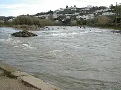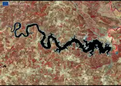 The Odeleite Dam (Barragem de Odeleite) was constructed in 1996 on the Odeleite River and serves as a key part of the water supply infrastructure in the Algarve region.[3] It has a crest length of 350 metres (1,150 ft), a height of 65 metres (213 ft), 50 metres (160 ft) of which are above the natural ground level, and a usable capacity of 117,000,000 cubic metres (153,000,000 cu yd) of water.[3][4] At full storage level of 52 metres (171 ft), the reservoir created by the dam has a total storage capacity of 130 hectometres (14,000 yd) and an inundated surface area of approximately 680.22 hectares (1,680.9 acres).[3][4]
