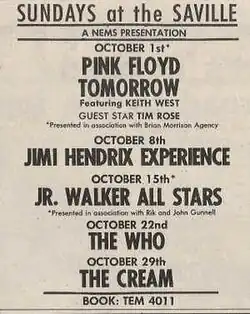 The venue saw appearances of The Jimi Hendrix Experience in January 1967 when they opened for The Who, and again in August 1967. The Move and Procol Harum also appeared on the bill. Acts including Chuck Berry, The Beatles, Jimi Hendrix, Pink Floyd, Elton John, Nirvana, Cream, Fairport Convention, the Incredible String Band and The Bee Gees also appeared there.[1][13]
