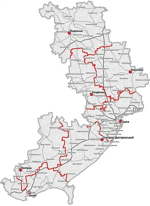 - Note: A caret (^) indicates the two municipalities and nine raions which previously constituted Izmail Oblast until that former oblast's merger with Odesa Oblast on 15 February 1954; these areas lie to the west of the Dniester River, and formerly constituted the territory known as the Budjak (southern Bessarabia). In the 18 July 2020 reorganisation, these nine raions were reduced to three, which also incorporated the two former independent cities.