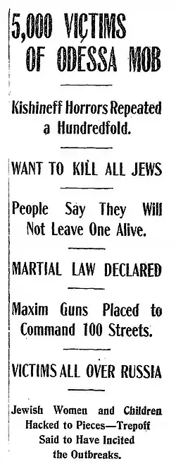 The 1905 pogrom of Odessa was the worst anti-Jewish pogrom in Odessa's history. Between 18 and 22 October 1905, ethnic Russians, Ukrainians, and Greeks killed over 400 Jews and damaged or destroyed over 1600 Jewish properties.[39] Historians such as Weinberg and Lambroza believe the police and hospital figures were likely an underestimate, with a range of estimates from 300, likely over 800, to over 1000 killed, and approximately over 2000 or even up to 5000 wounded.[2][3][4] Pogroms swept through the shtetls in 1905-1907.[40][41]