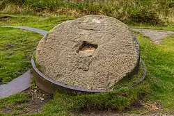 The site of Odin Mine is owned by the National Trust. It consists of a limestone gorge, the original early workings before they went underground to follow the veins of ore. It looks like a natural limestone ravine with the workings now disguised by natural vegetation. To the left of the gorge is the two-metre-wide Odin Cave, which goes about 10 metres underground. The remaining spoil heaps are a protected archaeological site and support a wide variety of plants including Birdsfoot Trefoil, Eyebright, Wild thyme and the Common spotted orchid. Some plants called metallophytes can tolerate the high levels of metal in the soil: these include Spring Sandwort and Alpine Scurvy-grass.[9] A gritstone crushing wheel, 1.75 metres in diameter with its iron tyre and circular iron track, used to crush the ore, can still be seen at the site. The crusher was built in 1823 at a cost of £40.[10]