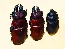 Odontolabis gazella can reach a length of about 40 millimetres (1.6 in) in females and of about 60 millimetres (2.4 in) in males. The basic colour is dark brown. The large mandible of males are used to wrestle each other for mating or food.